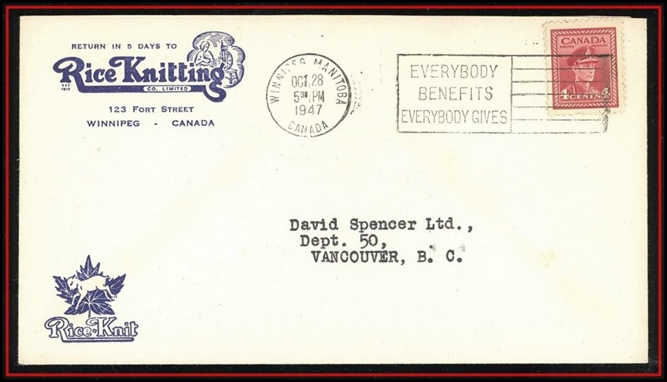1302 S o/CVR 254 RICE KNITTING Winnipeg Advert in blue,WINNPEG OC 29/47 + slogan to Vancouver