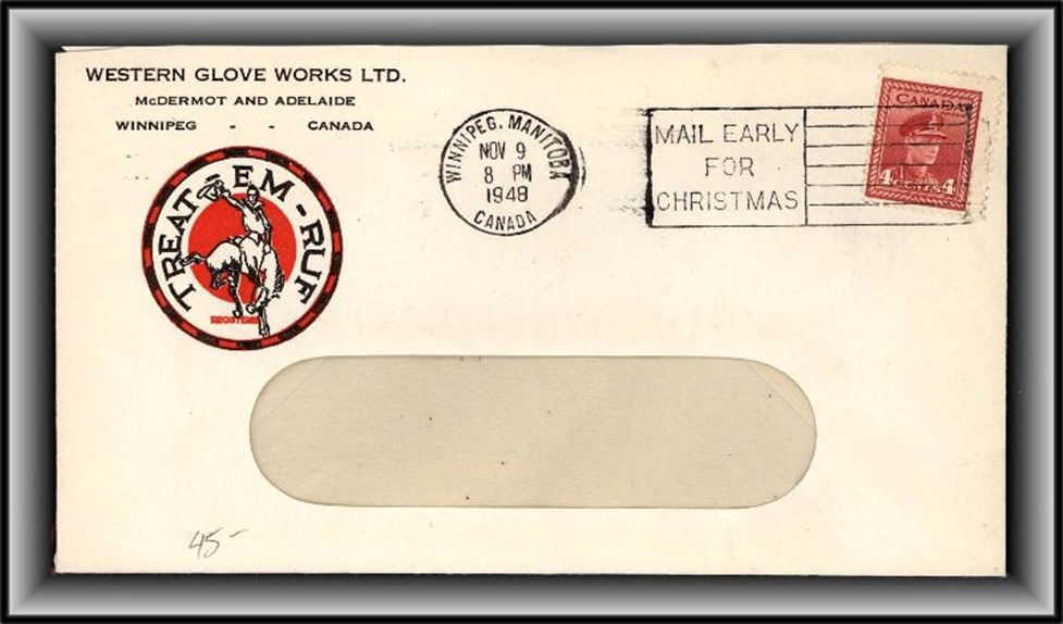 1303 S o/CVR 254 Western Glove Works TREAT-EM-RUF Cowboy & Bronco in colour,WINNIPEG NOV9/48,