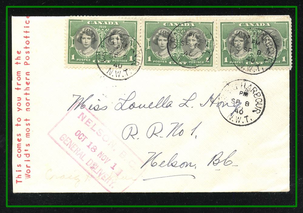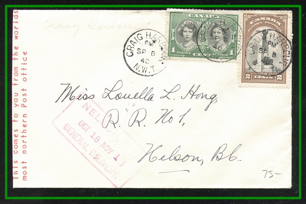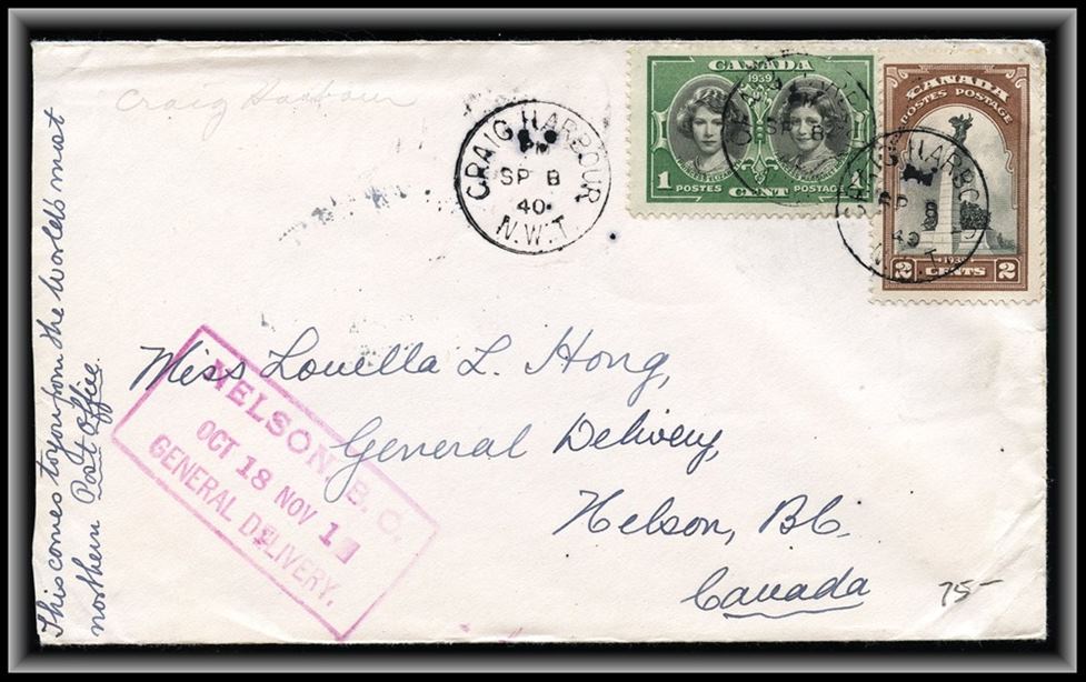 1325 P o/CVR 1940 CRAIG HARBOUR SP8/40 NWT, Nelson BC arrival,B/S Eastern Arctic Mail Service