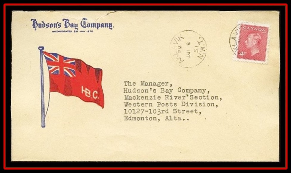 1327 P o/CVR 287 Hudsons Bay Co Flag AKLAVIK JAN 8/51 N.W.T CDS to Edmonton HBC. VF