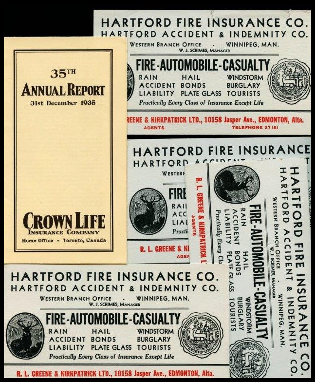 1342 S o/DOC HARTFORD FIRE INSURANCE R.Greene-Edmonton Alta advert. blotters (4) Crown Ins