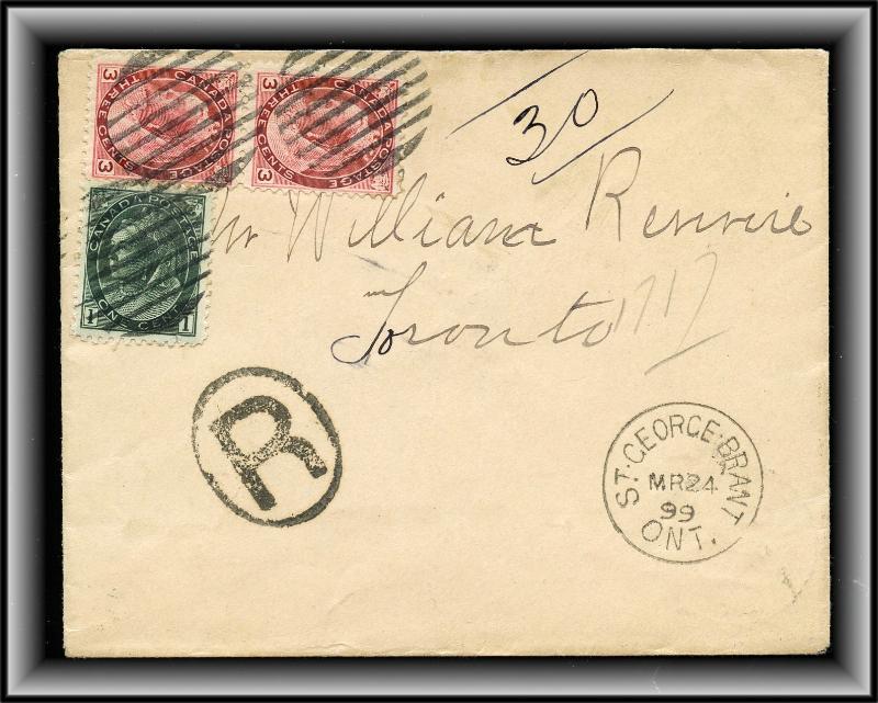 1908 S o/CVR 75 + 78 Vert Pr R in cir, ST GEORGE BRANT MR 24/99 ONT. B/S Same x 2,