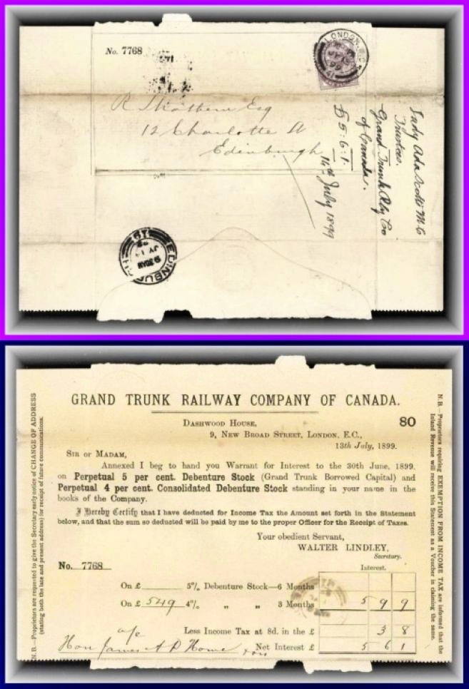 debenture of stock of Hon.J.Home,used LONDON WC JY 13/99, EDINBURGH arrival.