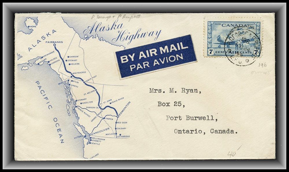 1923 S o/CVR 1945 ALASKAN HIGHWAY MAP showing route Advert,P.George + P.Rupert RPO 196/MR 24/