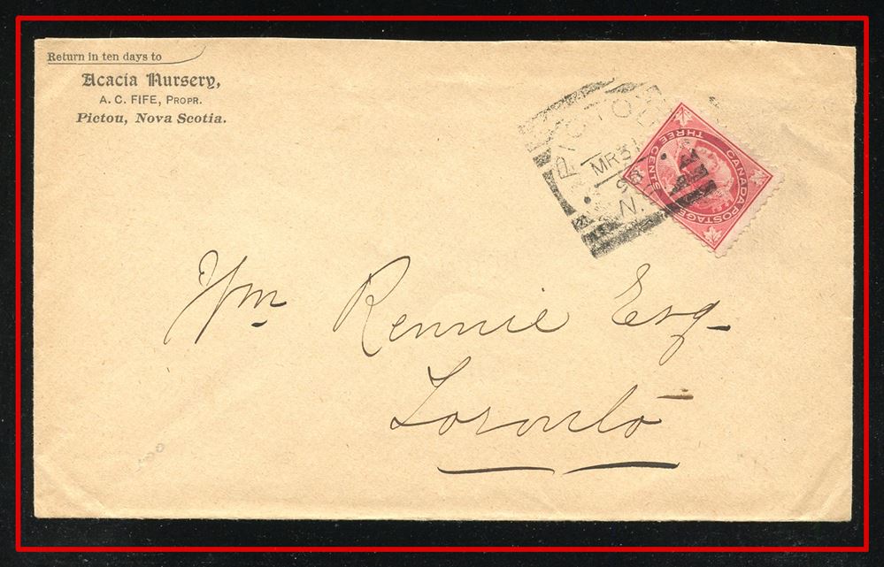 2036 S o/CVR 69 ACADIA NURSERY PICTOU MR 31/98 N.S SQ.Cir, Toronto arrival. VF